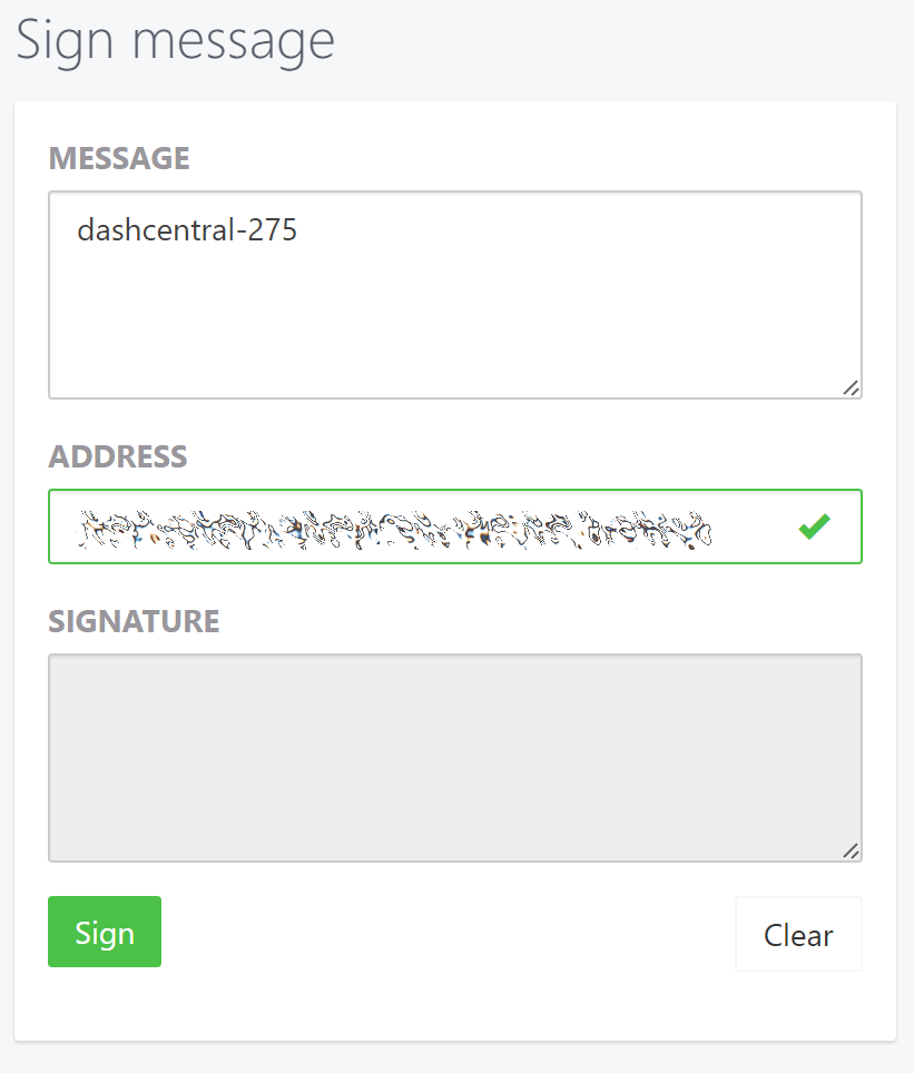 You can also issue a message from your address to verify ownership of your masternode to DashCentral. Click Unverified under Ownership and the following screen will appear: