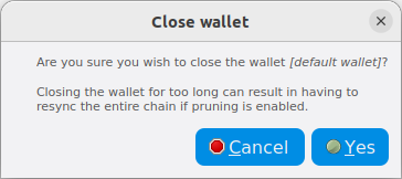 To close a wallet, set it as the active wallet using the wallet selection dropdown box. Next, click File -> Close Wallet… and then click Yes on the Close wallet confirmation screen.