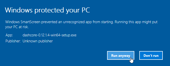 At this point, you may see a warning from Windows SmartScreen that the app is unrecognized. You can safely skip past this warning by clicking More info, then Run anyway.