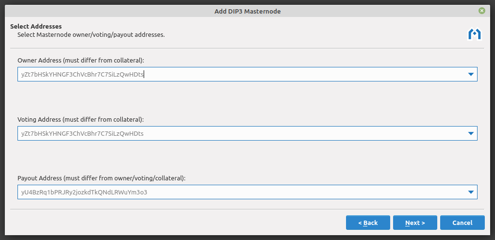 Select masternode owner, voting, and payout addresses#