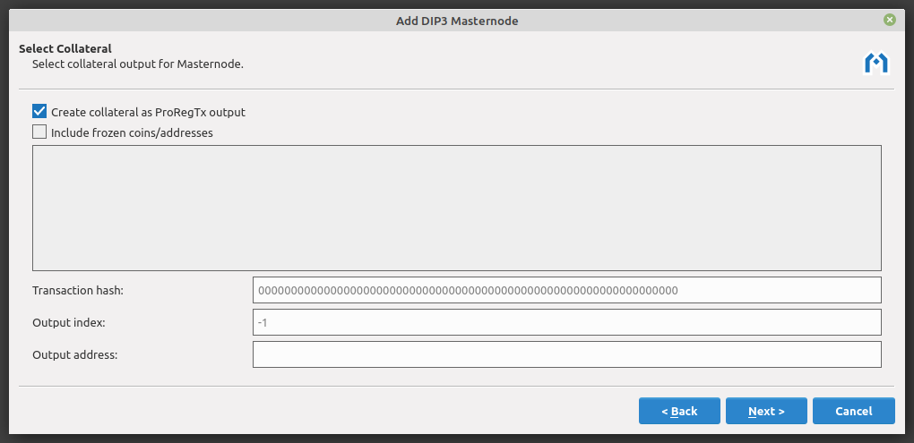 To start a masternode, you must have a 1000 DASH plus a small amount for fees available in your wallet. Leave Create collateral as ProRegTx output checked and click Next.