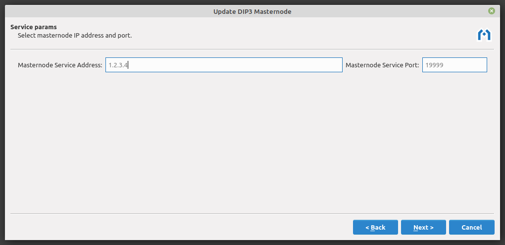 The masternode operator may update the IP address and port at any time. Update the IP address and click Next to continue.