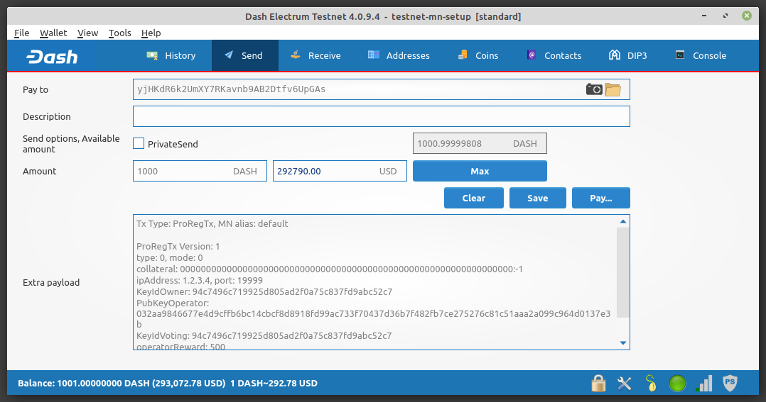 The ProUpRegTx information required to update the masternode registration was filled out by the previous step so just Click Pay… to complete the update.