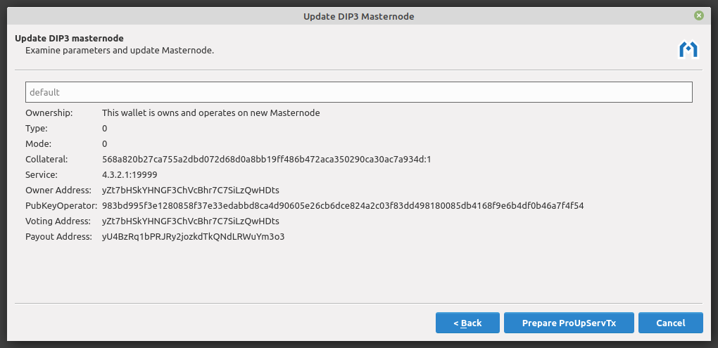 All parameters are now configured. This screen shows the updated configuration details. Click Prepare ProUpServTx to continue. The Send tab will open and be populated with the info necessary to update the masternode.