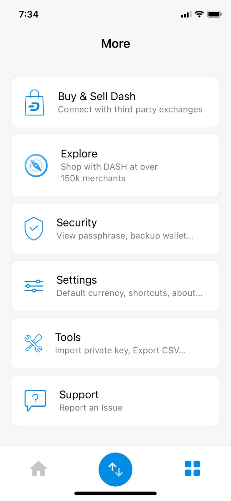 Certain masternode keys may be generated and stored in Dash Wallet. To access these keys, tap the Menu button and select Tools. Tap Masternode Keys and enter your PIN to open the Masternode Keys screen. From here, tap on any of the listed key types to view existing keys or generate new ones. The screen will show all used keys and the first unused one. To generate additional keys, tap the + button.
