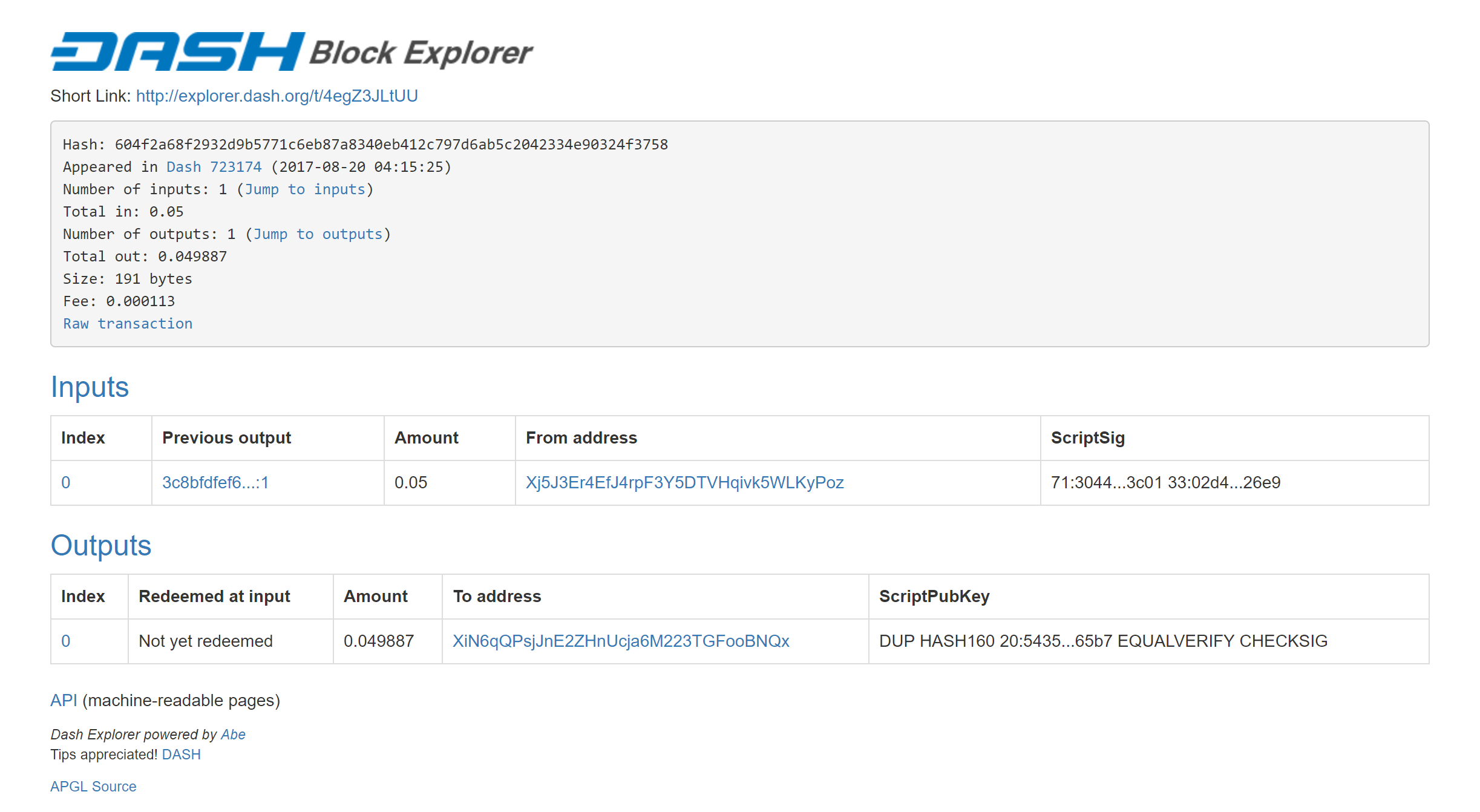 Viewing the balance of the paper wallet using the Dash Block Explorer at explorer.dash.org#