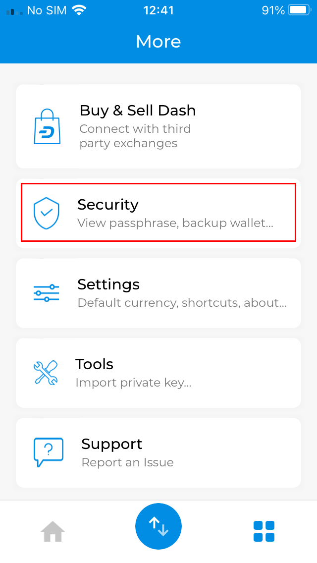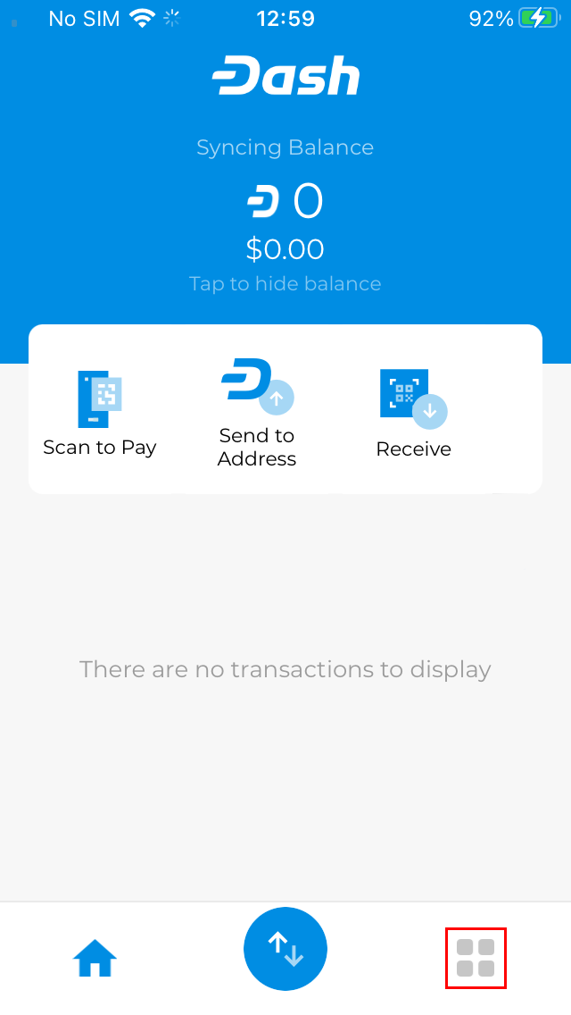 Ensure your Dash wallet is fully updated in the App Store, then open Dash. If this is the first time you are opening the app, you can enter your recovery phrase directly by selecting Recover wallet on the start screen. If you have an existing balance, either make another backup or transfer it to an external address, because restoring a wallet will replace your existing wallet!